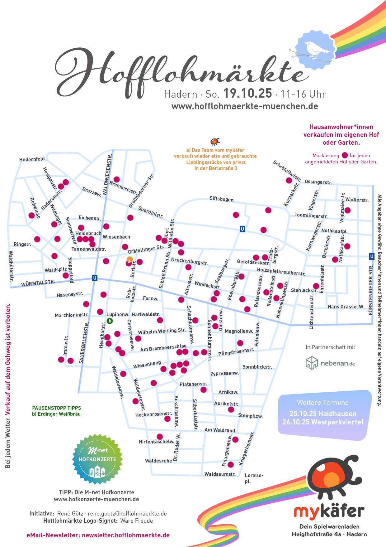 Der Verkauf darf nur im eigenen privaten Hof oder Garten auf Privatgrund stattfinden. Es dürfen keine Stände auf dem Gehweg oder öffentlichen Flächen aufgebaut werden. Diese Verkäufer*innen und Stände auf öffentlichen Flächen gefährden leider das Projekt der Hofflohmärkte und bereiten der Organisation einen unnötigen Mehraufwand, der sich langfristig auf eine Erhöhung der Teilnahmebeträge auswirken kann.